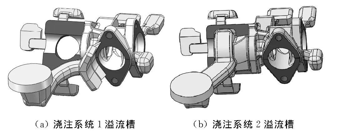 圖7 鑄件凝固后的溫度場 澆注系統1縮孔缺陷預測結果見圖8。由圖8可知,鑄件在壁厚區域的地方產生了縮孔缺陷,鑄件產生的縮孔體積為0.46cm3(去除溢流槽),切面處縮孔率為80%~90%,可以看出,澆注系統2也在鑄件厚壁區域產生縮孔缺陷,其產生的縮孔體積為0.16 cm3,切面處的縮孔率為80%~85%,比澆注系統1產生縮孔缺陷少,其主要原因是金屬液在澆注系統1條件下開始充填厚壁區域的時間較早,在凝固時厚壁區域溫度高,凝固速率慢,更易產生孤立液相,產生縮孔缺陷,因此澆注系統2更優。