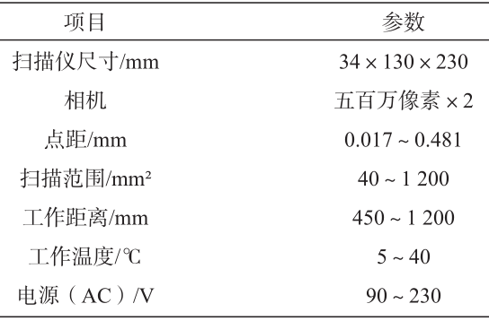 圖1 ATOS Compact Scan 5M三維光學掃描儀 ATOS掃描儀利用光學三角形原理,采用兩個電荷耦合器件(CCD)攝像頭檢測物體形狀,并合成三維數據。它還支持利用探針檢測,對鏡面等高反射表面及深孔等用CCD攝像頭難以拍攝的物體,由探針實施輔助檢測。該掃描儀在精度、銳化度和完整性方面均可達到基準質量水平,其技術規格見表1。