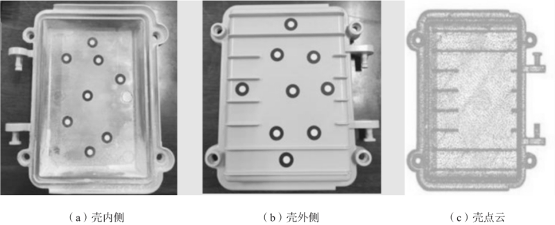 表1 ATOS Compact Scan 5M技術規格 考慮到該鋁合金零件內表面反光較強,為得到高精度測量結果,對其表面均勻噴涂顯像劑。由于ATOS 掃描頭需要對殼體各表面分別掃描,然后進行面點云數據的拼合,這需要在兩片獲取點云數據的表面重疊區域布置參考點,即在備測零件上貼黑圈白點。系統軟件通過對這些參考點的三維數據進行配準計算和坐標轉換,最終實現多片點云數據的拼合。零件噴涂顯像劑并貼參考點后的效果見圖2a和圖2b,掃描獲取的點云數據見圖2c所示。