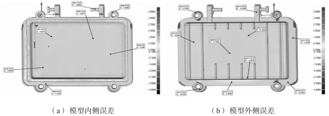 圖5 零件逆向效果圖 為驗證逆向建模尺寸的準確性,將逆向模型與經預處理后的點云進行比較分析(設定誤差上下限±4 mm),見圖6所示。由誤差標量顏色顯示可見,逆向殼體零件內外側平面誤差極小,圖中所選點誤差主要集中在±1×10-2~±1×10-1 mm區間,最大誤差主要分布于模型內側的邊沿,數量在1 mm級。