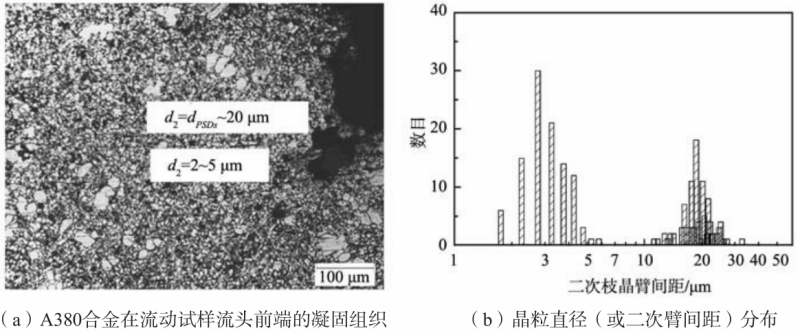 表3 二次枝晶臂間距和用公式(2)和(3)計算的局部凝固時間以及平均冷卻速度 2.4 A380 合金在壓鑄件中的枝晶形貌 在壓鑄過程中,當金屬液澆入壓室后受壓室急冷,開始形成一些鋁枝晶。這些枝晶通常稱為預結晶枝晶(pre-solidified dendrites,PSDs)或外生晶(Externally Solidified Crystals,ESCs)。然后,含有一定數量預結晶枝晶的金屬液被壓頭在一定的速度和壓力控制下壓入鑄型充型。這些預結晶枝晶的生長受壓頭推進所帶來的液態擾動影響,其晶體形貌介于圖5所示的形貌之間。 壓鑄件流動性試樣接近流頭的典型凝固組織見圖6a,存在兩類白色的枝晶組織。這兩類枝晶組織的尺寸呈雙峰分布,見圖6b。較大枝晶的直徑約20 μm,與圖5中的枝晶尺寸數量級接近。顯然,這些晶粒是壓室中形成的枝晶碎片,是預結晶枝晶或外生晶。較小晶粒的直徑約2~5 μm。部分小晶粒呈現一次枝晶臂及其整齊排列的二次枝晶臂,二次枝晶臂間距約2~5 μm。這些較小的晶粒應該是金屬液在鑄型中快冷所形成的枝晶組織。盡管圖5中的預結晶枝晶或外生晶的分布比較均勻,但是,這些預結晶枝晶在鑄件某些部位的分布極不均勻。