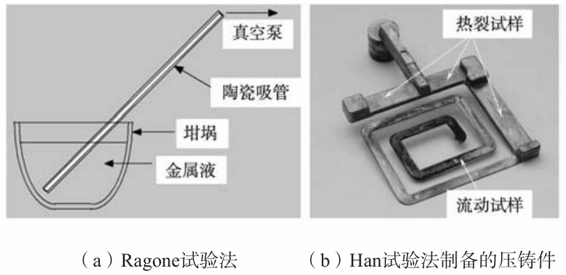 表2 試驗合金的液相線和固相線溫度,結晶溫度范圍和澆注溫度 1.2 流動性測試方法 使用了兩種方法測試合金的流動性。第一種是麻省理工開發的Ragone方法,見圖2a。合金液在表2給定的溫度下吸入內徑4 mm室溫陶瓷管,真空泵的壓力控制在82 cm水柱。陶瓷吸管的水平度對試驗結果影響不大。詳細的Ragone試驗方法參見麻省理工已發表的文獻。Ragone方法被認為是在重力鑄造條件下研究合金流動性的最精確的方法。 第二種是作者在橡樹嶺實驗室開發的Han方法。作者使用一臺128 t鎖緊力的壓鑄機,用H13鋼模具制備如圖2b所示的壓鑄件。模溫130 ℃,壓室內徑5.08 cm,壓頭最高速度254 cm/s,最大壓強13.8 MPa。詳細的壓鑄試驗條件參見作者已發表的文獻。鑄件由三段熱裂試樣和一段回形流動性試樣組成,可同時用于測定合金的熱裂傾向和流動性。熱裂試樣厚6 mm,寬32 mm,長分別為57 mm,76 mm,127 mm?;匦瘟鲃有栽嚇雍? mm,寬15 mm,長914 mm。熱裂試樣可視為壓鑄件的橫澆道,流動性試樣的入口可視為壓鑄件的內澆道?;匦蔚倪呴L隨合金液的充型流動而遞減。這樣的流動性試樣設計,使壓鑄條件下離散的流頭液滴獲得一定的形狀規范,從而減小離散流頭液滴由于與主流充型液流分離而帶來的流動長度測量誤差。然而,即使使用這樣的回形流動試樣,凝固后的流頭仍然極易在鑄件脫模時從鑄件本體脫落而成為碎片,帶來一定的試驗誤差。 1.3 壓室中的凝固組織模擬 在圖2b所示的熱裂試樣和流動試樣中,往往含有部分在壓室中形成的枝晶組織。為區別壓室內形成的枝晶組織和鑄型內形成的組織,選用A380鋁合金,在表2中的過熱度條件下,澆入與壓室內徑相同的鋼管,開展了兩個凝固試驗,以揭示壓鑄條件下合金液流動停止機理。第一個是合金液自然凝固,以確定合金的二次枝晶臂間距。第二個是合金液在高強超聲攪拌作用條件下的凝固,近似模擬金屬液在壓室中受到強制擾動時破碎枝晶的形貌。詳細的試驗條件參見作者已發表的文獻。