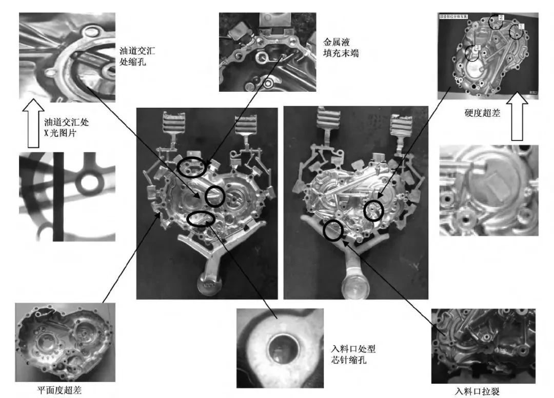 廣東鴻圖科技股份有限公司工程師安肇勇等在《特種鑄造及有色合金》期刊上發表了題為“變速箱側蓋壓鑄成形的缺陷分析及對策”的文章,作者針對某變速箱側蓋鋁合金的壓鑄成形,應用數值模擬方法,分析鋁合金液體流動充型狀態與鑄件缺陷的分布,確定了鑄件的澆注系統與排氣系統,大大減少了模具的開發周期。同時在試模與試生產階段,從澆注、工藝、模具等方面分析了不同缺陷產生的原因,提出了改善措施。結果表明,合理的澆注、排氣系統與合理的冷卻是獲得高品質壓鑄件的關鍵。 圖文結果 本課題開發的汽車變速箱側蓋壓鑄件見圖1。該鑄件輪廓尺寸為425 mm×355 mm×71 mm,質量為3.3kg,平均壁厚為2.3mm,投影面積為112280mm2鑄件材質為Al-11Si-2Cu,有多處厚壁熱節部位,易產生縮孔缺陷;產品毛坯平面度要求為0.6 mm,外觀無明顯的壓痕;產品加工后密封面氣縮孔為Φ0.5~1.0mm的允許1個,小于Φ0.5mm的允許2個,軸承孔機加工后不允許有氣縮孔外露;內腔試漏壓力為0.05MPa,泄漏量≤8mL/min,油道試漏壓力為0.3 MPa,泄漏量≤8mL/min;硬度(HB)≥58。該鑄件在13500kN的壓鑄機上生產。