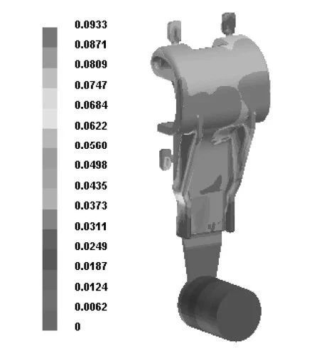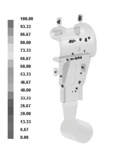 圖7 壓塊縮松分布 根據(jù)壓塊壓鑄件的結(jié)構(gòu)及模擬分析結(jié)果,設(shè)計(jì)出壓塊壓鑄件的半固態(tài)壓鑄模具,見圖8。半固態(tài)壓鑄模具在結(jié)構(gòu)上與一般的壓鑄模具相同,在生產(chǎn)前要對(duì)模具充分預(yù)熱,由于半固態(tài)的溫度較低,凝固時(shí)間短,因此模具在預(yù)熱時(shí)要比液態(tài)壓鑄高,一般在280~300℃,需在動(dòng)、定模套板上設(shè)計(jì)加熱元件和測(cè)溫孔,安裝熱電偶測(cè)溫,以便控制模具溫度,同時(shí)要求模具各個(gè)部位溫度均勻穩(wěn)定。