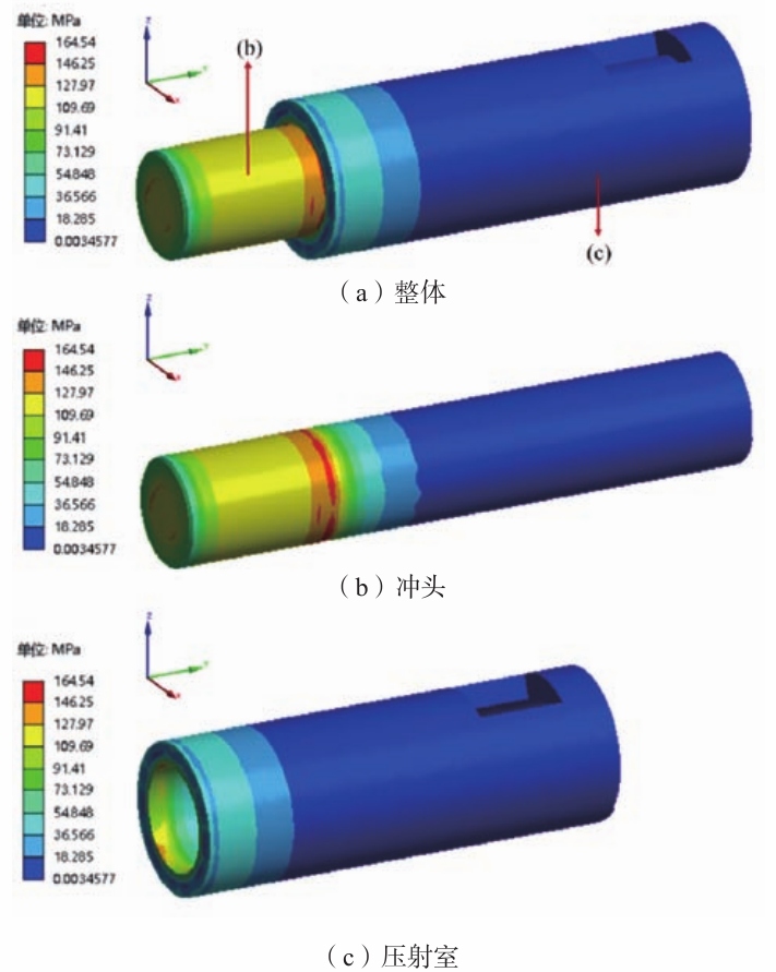 圖6 壓射室部分總變形云圖 壓射室部分的等效應力云圖如圖7所示??梢钥闯?,沖頭在距離左端1/4位置,也就是保壓狀態下與壓射室最左端接觸的位置產生的等效應力最大,其值為164.5 MPa。從沖頭與壓射室左端接觸點開始,向左逐漸減小,端點處最小等效應力值為62.8 MPa,向右也逐漸減小,最小值為0.003 MPa。壓射室等效應力最大值出現在左端面的內徑處,其最大等效應力值為146.3 MPa,往右逐漸減小,當距離左端點距離大致為壓射室整體長度的1/6時,達到最小的等效應力值,為0.003 MPa。