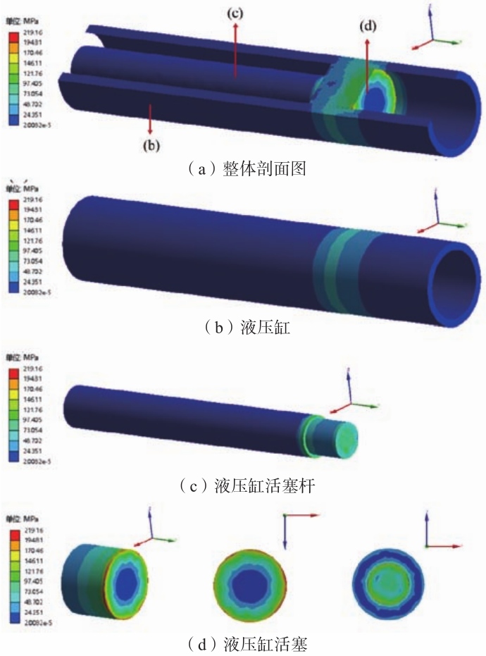 圖9 液壓缸部分總變形云圖 液壓缸部分產生的等效應力云圖如圖10所示。液壓缸整體所受等效應力較小,最大等效應力出現的地方為液壓缸與液壓缸活塞接觸的地方,其最大值僅為73.1 MPa。液壓缸活塞桿受到來自右側液壓缸活塞傳遞的壓力,作用在液壓缸活塞桿的右端面。在端面上,等效應力由中心往外減小,中心處最大應力值為121.8 MPa,外直徑位置的最小應力值為70.3 MPa。