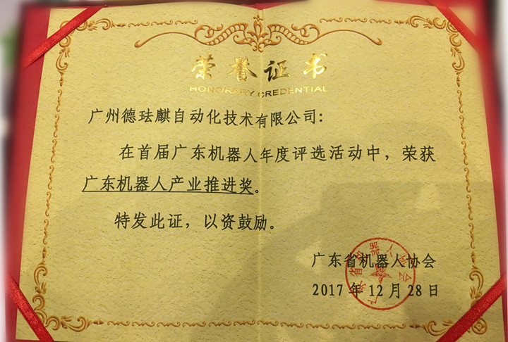 廣州德琺麒獲得“廣東機器人產(chǎn)業(yè)推進獎”證書 廣東機器人年度評選是廣東省機器人協(xié)會成立以來舉辦的第一屆評選活動,旨在表彰、激勵2017年對廣東省機器人產(chǎn)業(yè)作出突出貢獻的企業(yè),發(fā)揮先進企業(yè)的示范引領(lǐng)作用,推動形成創(chuàng)新、創(chuàng)業(yè)的社會氛圍,助力機器人技術(shù)革新和產(chǎn)業(yè)發(fā)展。