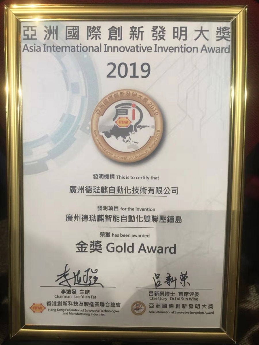![]() 蒲昌月先生與FITMI領(lǐng)導合影,右1為FITMI主席李遠發(fā)先生 11月25日晚,2019 FITMI香港創(chuàng)新科技成就大獎頒獎典禮,在香港亞洲國際博覽館隆重舉行。廣州德琺麒自動化技術(shù)有限公司開發(fā)的智能自動化雙聯(lián)壓鑄島,斬獲由香港創(chuàng)新技術(shù)及制造業(yè)聯(lián)合總會(FITMI)評選的“2019香港創(chuàng)新科技成就大獎:亞洲國際創(chuàng)新發(fā)明大獎之金獎”。廣州德法麒總經(jīng)理蒲昌月先生代表公司出席典禮和領(lǐng)獎。 據(jù)悉,智能自動化雙聯(lián)壓鑄島此前已獲得兩個獎項。在今年3月舉行的“2019中國鑄博會”上,獲得由中國鑄造協(xié)會評定的“2019全國鑄造裝備創(chuàng)新獎”;在7月的“2019中國壓鑄展”上,榮獲由鑄造行業(yè)生產(chǎn)力促進中心、中國機械工程學會鑄造分會聯(lián)合評定的“2019壓鑄行業(yè)年度創(chuàng)新技術(shù)獎”。