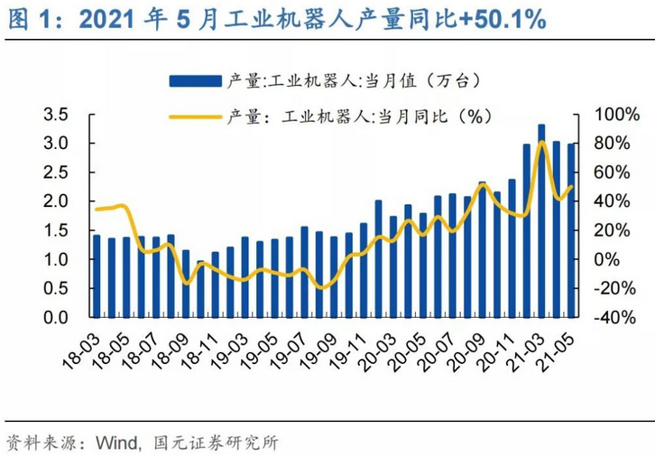 ![]() 據(jù)國家統(tǒng)計局?jǐn)?shù)據(jù)顯示,2021年5月工業(yè)機(jī)器人產(chǎn)量為29743套,同比增長50.1%;1-5月工業(yè)機(jī)器人累計產(chǎn)量為136405套,同比增長73.2%。與3、4月份相比,5月份產(chǎn)量雖然小幅回落,但仍然處于高速增長區(qū)間內(nèi)。 分析指出,后疫情時代,中國市場制造業(yè)持續(xù)回暖,機(jī)器人的需求確定性獲增強(qiáng),不少外資龍頭廠商直接受益于下游需求回暖,對華出貨量增長明顯,如發(fā)那科、雅馬哈等,2021年一季度在華出貨量增速超100%。