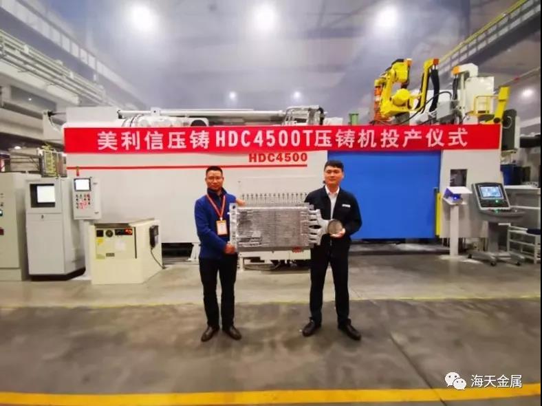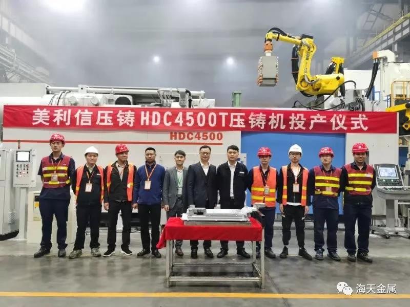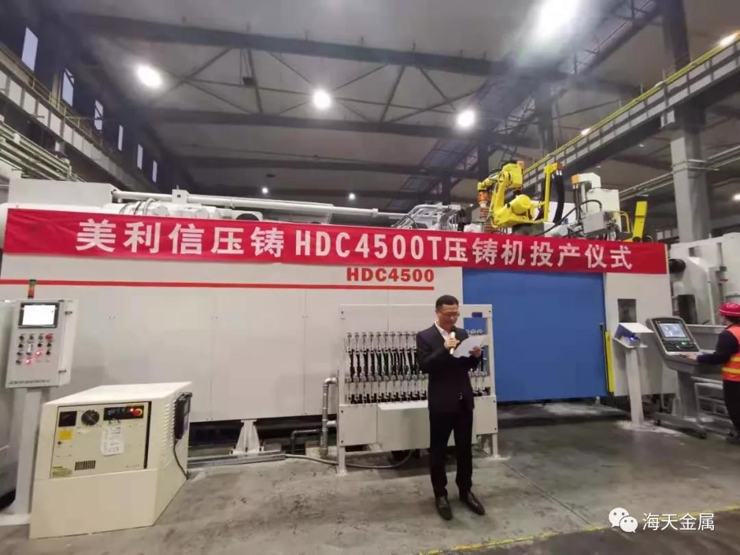 ![]() 2019年10月30日下午,寧波海天金屬成型設備有限公司(簡稱“海天金屬”)制造的首臺4500T壓鑄機,在重慶大江美利信壓鑄有限責任公司(簡稱“美利信壓鑄”)的廠房內舉行了投產儀式。美利信壓鑄集團常務副總裁馬名海先生,設備總監胡鍇先生,模具公司總經理周承廣先生,重慶海天塑機總經理韋真先生,重慶海天金屬總經理張學進先生,海天金屬技術科科長徐建華先生,海天金屬服務中心經理金高兵先生出席了本次投產儀式。