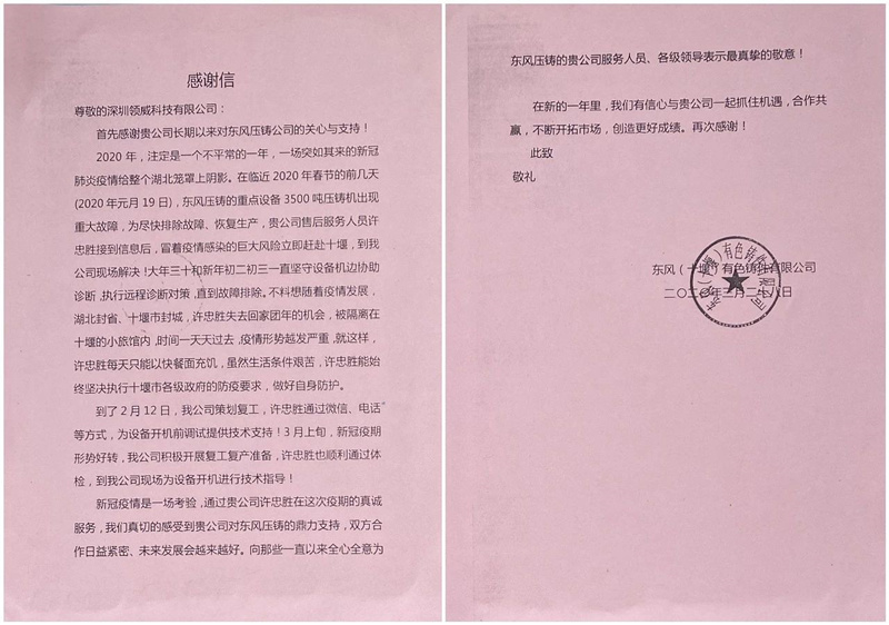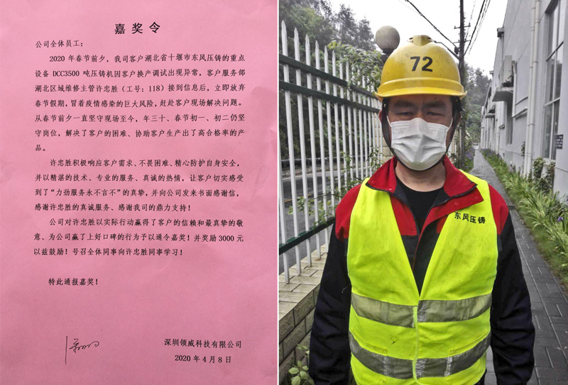 ![]() 2020年,對每一個力勁人來說,是極不尋常的一年。一場突如其來的COVID-19疫情給力勁集團中國地區(qū)客戶的售后服務(wù)支持,帶來了較大影響。繼2003年“非典”疫情之后,“力勁服務(wù)永不言不”的承諾又一次經(jīng)受著重大考驗。 2020年春節(jié)臨近的1月19日,離十堰“封城”還有5天,位于湖北十堰的東風(fēng)(十堰)有色鑄件有限公司(東風(fēng)壓鑄)的重點設(shè)備3500噸壓鑄機因換產(chǎn)調(diào)試出現(xiàn)異常。接到客戶訴求后,力勁客戶服務(wù)部第一時間做出響應(yīng)。負(fù)責(zé)湖北區(qū)域機修服務(wù)的許忠勝主動請纓,放棄即將與家人春節(jié)團聚的機會,冒著疫情風(fēng)險,趕赴十堰,為客戶排憂解難。 “從大年三十到正月初三,力勁的員工一直在機器旁邊堅守,協(xié)助診斷,執(zhí)行遠(yuǎn)程診斷對策,直到故障排除。此時的十堰已經(jīng)封城。按照政府防疫要求,他一直待在小旅館做自我隔離防護(hù)。一直到2月12日,我司策劃復(fù)工,他還通過微信、電話等方式,為設(shè)備開機前調(diào)試提供技術(shù)支持。我司正式復(fù)工復(fù)產(chǎn)后,他還親臨現(xiàn)場為設(shè)備開機進(jìn)行技術(shù)指導(dǎo)。”東風(fēng)壓鑄的工作人員表示。