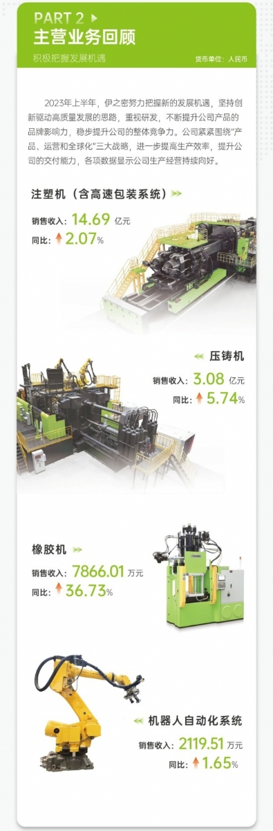 ![]() 8月30日,深交所上市企業(yè)--伊之密股份有限公司(簡(jiǎn)稱(chēng):伊之密)在2023年上半年業(yè)績(jī)報(bào)告中表示,今年上半年,全球經(jīng)濟(jì)形勢(shì)依然復(fù)雜多變,公司通過(guò)推出新產(chǎn)品、改變銷(xiāo)售策略、優(yōu)化供應(yīng)鏈管理等策略積極應(yīng)對(duì),努力提升公司業(yè)績(jī)。從公司所處行業(yè)來(lái)看,下游汽車(chē)行業(yè)繼續(xù)保持增長(zhǎng)態(tài)勢(shì),尤其在新能源汽車(chē)板塊,有較快速的增長(zhǎng),為公司帶來(lái)新的發(fā)展機(jī)遇。