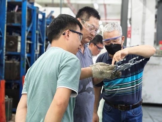 ◆ 講解模具設計知識 隨著業務的快速發展,2024年,索斯科(深圳)再次增購一套富來冷室壓鑄島,包括富來冷室壓鑄機QC380及全套自動化周邊設備,實現了其在更大鑄件的生產能力上的提升。經過2周緊鑼密鼓的安裝、調試、培訓工作,此套富來QC380冷室壓鑄島已快速投入量產中。