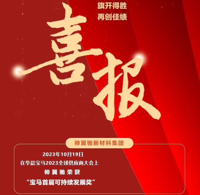 2023年10月19日,在華晨寶馬2023全球供應商大會上,帥 翼 馳 榮 獲“寶馬首屆可持續發展獎”。