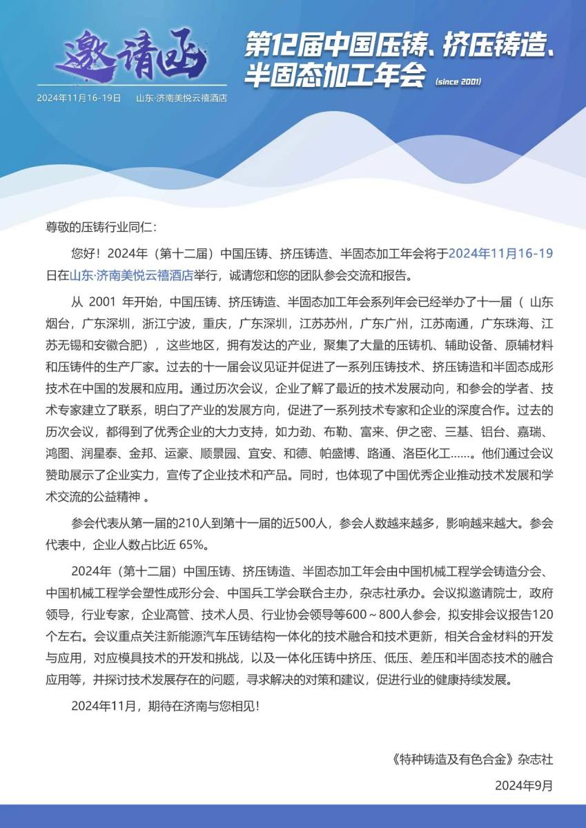 2024中國壓鑄、擠壓鑄造、半固態(tài)加工年會邀請函