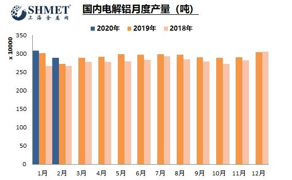 2020年2月我國電解鋁產量在289萬噸,環比下滑6.17%,同比增加6.45%。