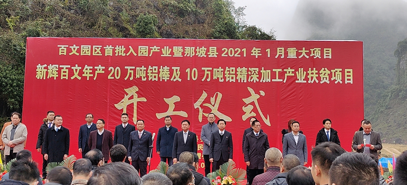 1月6日,那坡縣2021年1月重大項目--新輝百文年產20萬噸鋁棒及10萬噸鋁精深加工產業扶貧項目開工。