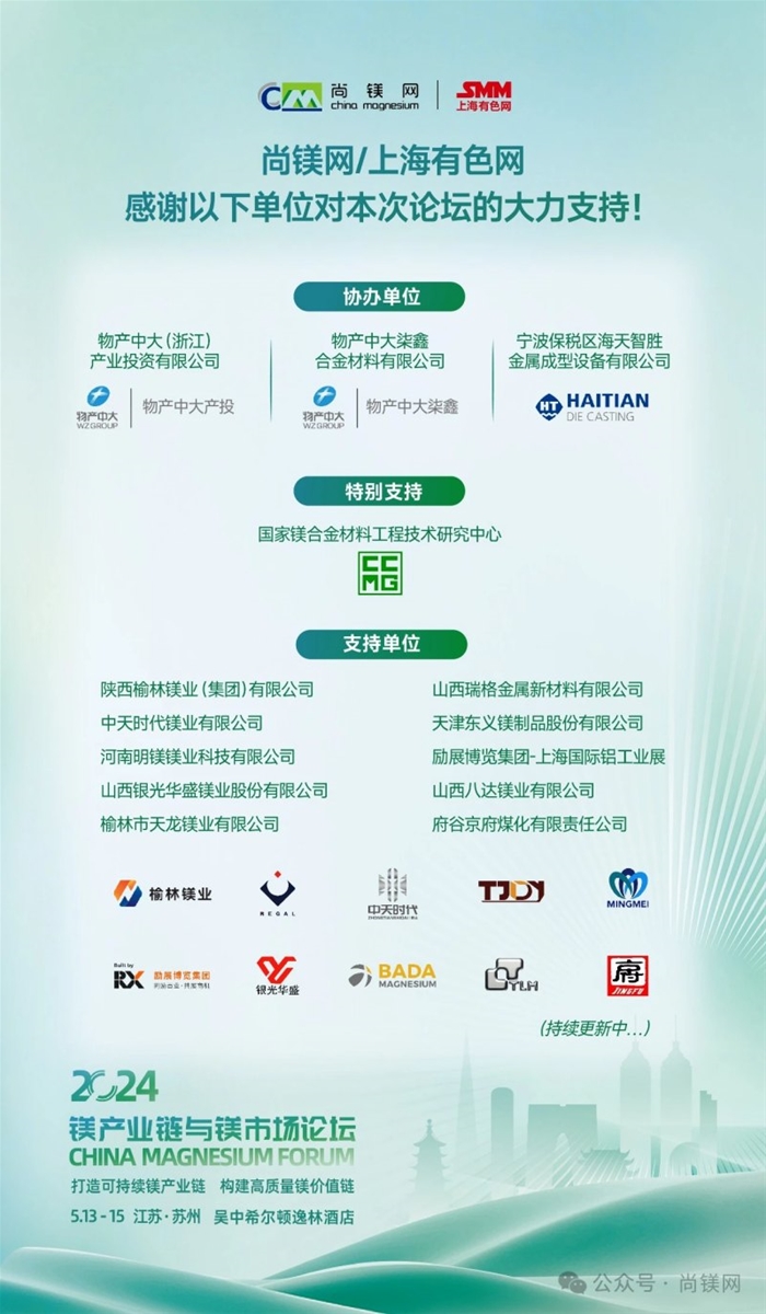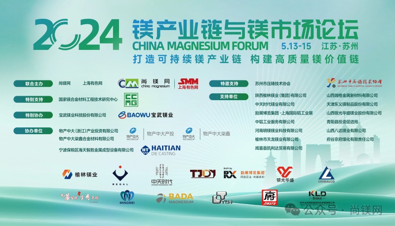 尚鎂網和上海有色網聯(lián)合多家合作單位,于2024年5月13-15日在蘇州市舉辦“2024鎂產業(yè)鏈與鎂市場論壇”,為鎂產業(yè)鏈企業(yè)和用戶、研發(fā)機構搭建信息與合作的平臺。