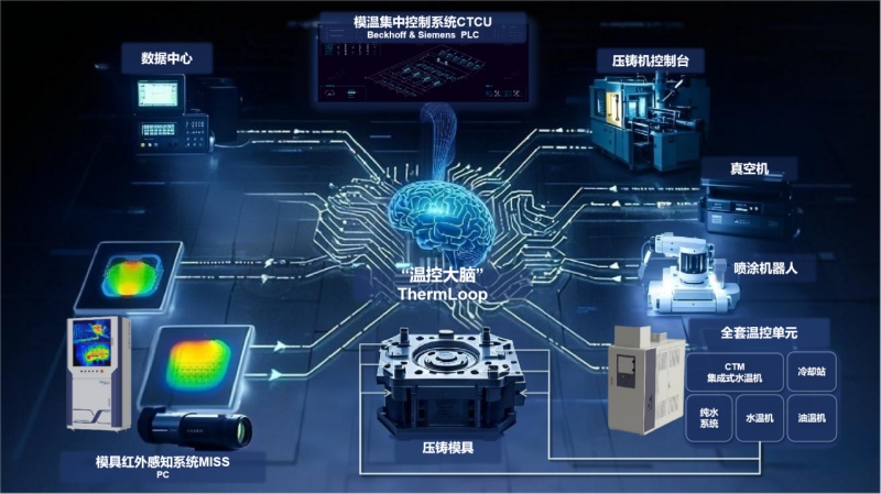 技術(shù)控制原理 數(shù)據(jù)采集(反饋環(huán)節(jié)) 系統(tǒng)通過模具紅外感知系統(tǒng)(MISS)實(shí)時(shí)監(jiān)測(cè)模具溫度,同時(shí)收集各溫控設(shè)備(如機(jī)邊冷卻單元、油模溫機(jī)等)的管路數(shù)據(jù),形成全面的溫度反饋信息。 數(shù)據(jù)處理與決策(控制環(huán)節(jié)) 反饋的溫度數(shù)據(jù)被傳輸至“溫控大腦”(ThermLoop算法)。該算法基于傳熱原理和智能技術(shù),將實(shí)際溫度與預(yù)設(shè)目標(biāo)溫度進(jìn)行比較,計(jì)算所需的調(diào)整參數(shù)(如導(dǎo)熱介質(zhì)的流量或溫度),并通過校驗(yàn)確保參數(shù)的準(zhǔn)確性。 執(zhí)行調(diào)整(執(zhí)行環(huán)節(jié)) 計(jì)算出的參數(shù)由模溫集中控制系統(tǒng)(CTCU)下發(fā)至各溫控設(shè)備,設(shè)備通過調(diào)節(jié)管路中導(dǎo)熱介質(zhì)的物理參數(shù)(如流速、溫度),精準(zhǔn)輸入或帶走熱量,從而控制模具溫度。 動(dòng)態(tài)平衡(閉環(huán)循環(huán)) 調(diào)整后的溫度再次被MISS檢測(cè),形成新的反饋數(shù)據(jù)。系統(tǒng)持續(xù)循環(huán)這一過程,確保模具溫度快速收斂至目標(biāo)值并保持穩(wěn)定,即使面對(duì)異常情況(如鋁液溫度波動(dòng)或停機(jī)),也能通過歷史數(shù)據(jù)和智能算法維持生產(chǎn)的連續(xù)性與穩(wěn)定性。 技術(shù)革新特點(diǎn) 該系統(tǒng)具備超智能AI閉環(huán)控溫功能,在真實(shí)壓鑄場(chǎng)景中首次實(shí)現(xiàn)了全自動(dòng)化的自主模溫閉環(huán)控制。在保證合格率的前提下,相較于人工調(diào)控,ThermLoop自動(dòng)控溫將壓鑄節(jié)拍降低了15%-30%,大大縮短了噴涂和吹氣時(shí)間,真正實(shí)現(xiàn)了模具溫度的閉環(huán)控制,使生產(chǎn)變得更加輕松簡(jiǎn)單。 創(chuàng)新產(chǎn)品優(yōu)勢(shì) 上一代產(chǎn)品不能夠?qū)崿F(xiàn)自動(dòng)化溫度控制,生產(chǎn)節(jié)拍長(zhǎng),控制不智能,工藝調(diào)節(jié)難度大。 專利情況