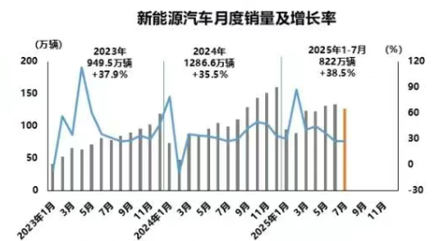 尤為引人關(guān)注的是新能源汽車市場。7月,新能源汽車產(chǎn)銷分別完成124.3萬輛和126.2萬輛,同比分別增長26.3%和27.4%,新能源汽車新車銷量達(dá)到汽車新車總銷量的48.7%,接近半數(shù),市場滲透率進(jìn)一步提升。 據(jù)中國汽車工業(yè)協(xié)會(huì)分析,7月車市進(jìn)入傳統(tǒng)淡季,部分廠家安排年度設(shè)備檢修,導(dǎo)致產(chǎn)銷節(jié)奏有所放緩,環(huán)比呈現(xiàn)季節(jié)性回落。不過,從行業(yè)市場環(huán)境來看,以舊換新政策效果持續(xù)顯現(xiàn),行業(yè)綜合整治“內(nèi)卷”工作取得積極進(jìn)展,企業(yè)新車型不斷投放市場,這些因素共同助力車市平穩(wěn)運(yùn)行,實(shí)現(xiàn)了同比正增長。 2025年1-7月,汽車市場整體保持增長態(tài)勢。1-7月,汽車產(chǎn)銷分別完成1823.5萬輛和1826.9萬輛,同比分別增長12.7%和12%,產(chǎn)銷增速較1-6月分別擴(kuò)大0.2個(gè)和0.6個(gè)百分點(diǎn)。其中,乘用車產(chǎn)銷分別完成1583.8萬輛和1584.1萬輛,同比分別增長13.8%和13.4%;商用車產(chǎn)銷分別完成239.7萬輛和242.8萬輛,同比分別增長6%和3.9%。1-7月汽車出口368萬輛,同比增長12.8%。 新能源汽車在1-7月同樣表現(xiàn)出色。新能源汽車產(chǎn)銷分別完成823.2萬輛和822萬輛,同比分別增長39.2%和38.5%,新能源汽車新車銷量達(dá)到汽車新車總銷量的45%。從國內(nèi)市場來看,新能源汽車國內(nèi)銷量占汽車國內(nèi)銷量比例為47.4%。同時(shí),新能源汽車出口成績斐然,1-7月出口130.8萬輛,同比增長84.6%,成為推動(dòng)汽車出口增長的重要力量。 |