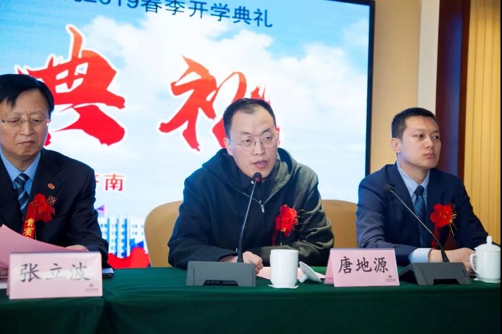 圣泉集團總裁唐地源在開學典禮上致辭 圣泉分院教師代表山大材料學院鄭洪亮教授和學生代表王翔宇分別作了發言。隨后,國開學院領導分別為教師代表和學生代表頒發了講師聘書和學生證。