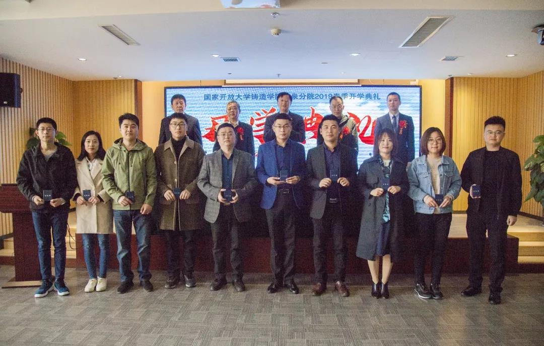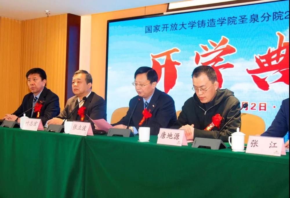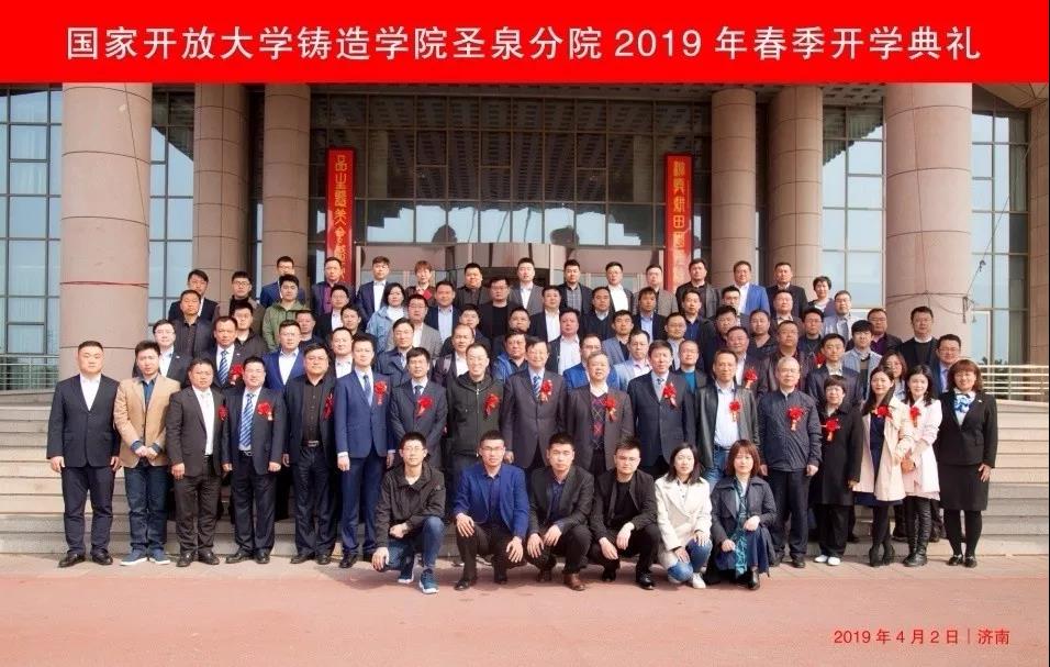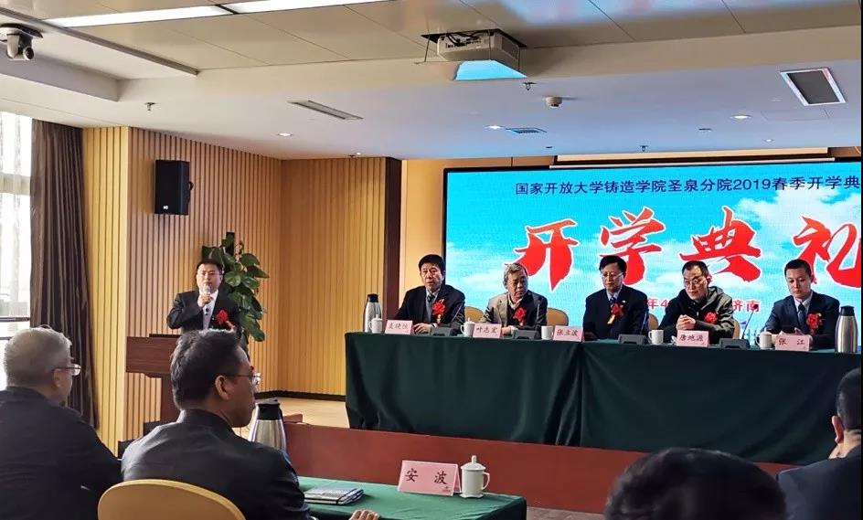 ![]() 開學典禮由圣泉分院常務副院長王軍主持,并全程進行了網絡直播。典禮在莊嚴的國歌聲中開始。 4月2日上午,國家開放大學鑄造學院圣泉分院2019春季開學典禮在濟南隆重舉行。中國鑄造協會會長、國家開放大學鑄造學院院長張立波,中國鑄造協會副監事長、國家開放大學鑄造學院執行副院長支曉恒,國家開放大學教務部部長葉志宏,國家開放大學教務部副部長鄭潔,圣泉集團總裁兼圣泉分院院長唐地源,山東鑄造協會秘書長張江,中國鑄造協會職教中心主任景立文,鑄造學院院長助理李子軍,國家開放大學教務部考風考紀科科長潘焦萍,國家開放大學教務部合作辦學辦公室副主任王國鵬,圣泉集團副總裁祝建勛,圣泉集團工業品營銷總監薛峰,圣泉集團鑄造材料銷售總監袁永等領導出席典禮。本次典禮還特邀山東省重要鑄造企業領導出席:濟南重汽集團濟南動力有限公司總經理安波、煙臺勝地汽車零部件制造有限公司副總經理鄭云霞、山東豪邁機械科技股份有限公司鑄造事業部總經理姚遠、玫德集團玫德大學院長陳蔚、山東匯豐鑄造科技股份有限公司總經理劉慶坤、淄博乾能鑄造科技有限公司董事長王峰、山東豐晃鑄造有限公司總經理趙學通、山東銀鷹炊事機械有限公司總經理李忠民。 張立波會長在開學典禮上作了重要發言,他指出,中國鑄造協會與國家開放大學合作成立鑄造學院,旨在為鑄造行業提供人才學歷和能力提升的渠道,圣泉作為鑄造材料的大型生產企業,規模產能位居世界前列,圣泉分院的成立,為在職員工提升學歷和技術水平提供了優質平臺,必將推動山東省鑄造行業的人才培養。張會長把第一期學生比喻為“黃埔一期”學員,他們將實現不離崗、不離廠的“大學夢”。