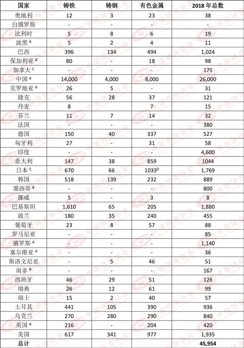 注:A)2016年數據 B)2017年數據 C)包含球墨鑄鐵 D)2015年數據 E)包含所有有色合金 F)包含鋅合金 G)包含所有鐵合金 表2:2018年各國/地區鑄造企業數