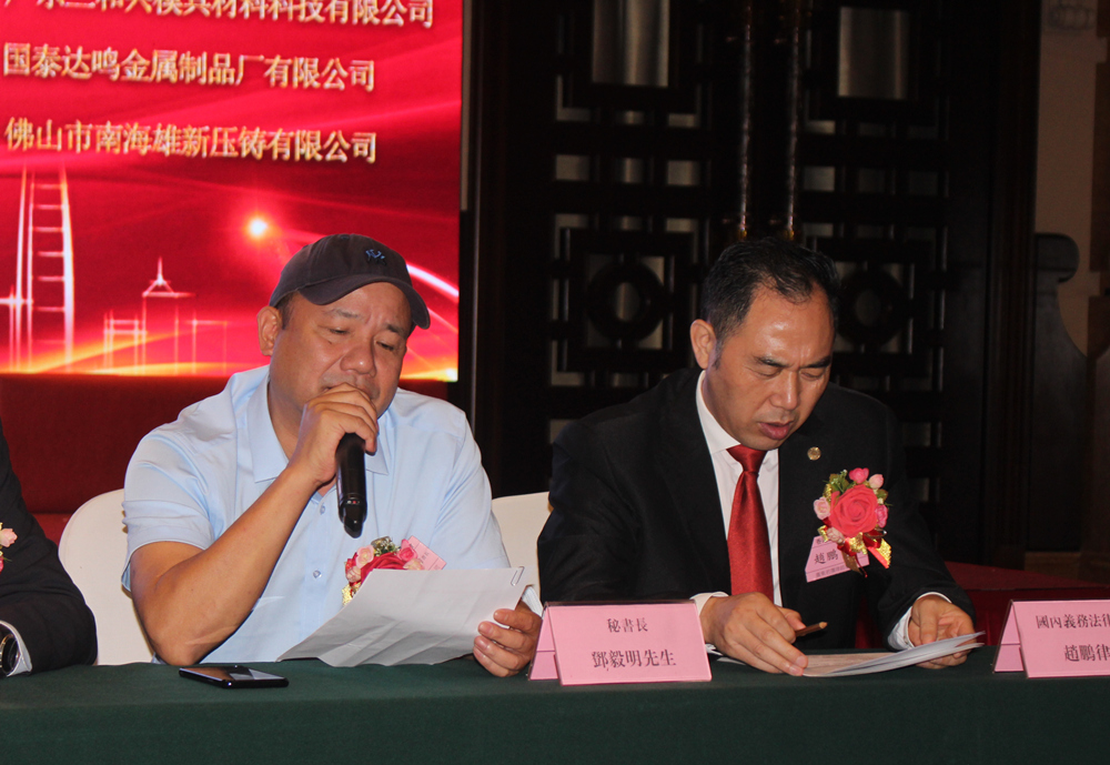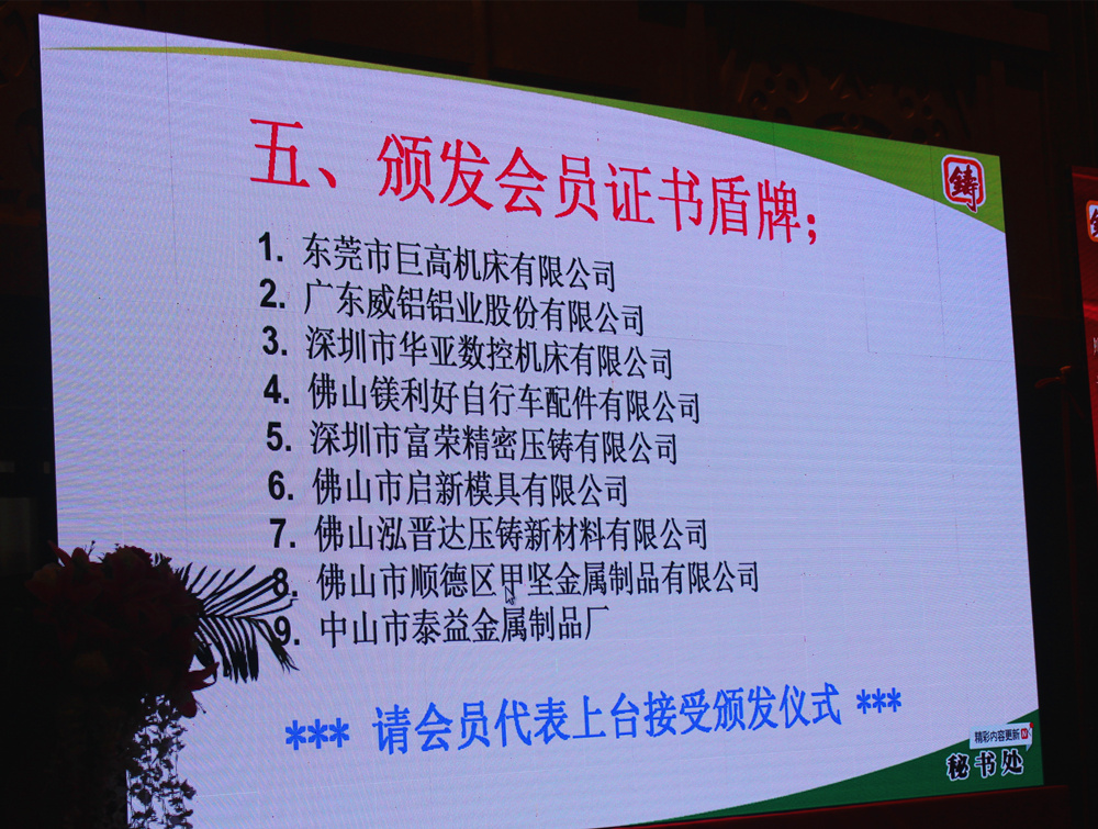 為會(huì)員企業(yè)頒發(fā)會(huì)員盾牌 會(huì)上,蔡子芳會(huì)長(zhǎng)為東莞市巨高機(jī)床有限公司、廣東威鋁鋁業(yè)股份有限公司、深圳市華亞數(shù)控機(jī)床有限公司、佛山鎂利好自行車(chē)配件有限公司、深圳市富榮精密壓鑄有限公司、佛山市啟新模具有限公司、佛山市泓晉達(dá)壓鑄新材料有限公司、佛山市順德區(qū)甲堅(jiān)金屬制品有限公司、中山市泰益金屬制品廠等9家會(huì)員企業(yè)代表一一頒發(fā)會(huì)員盾牌,并合影留念。