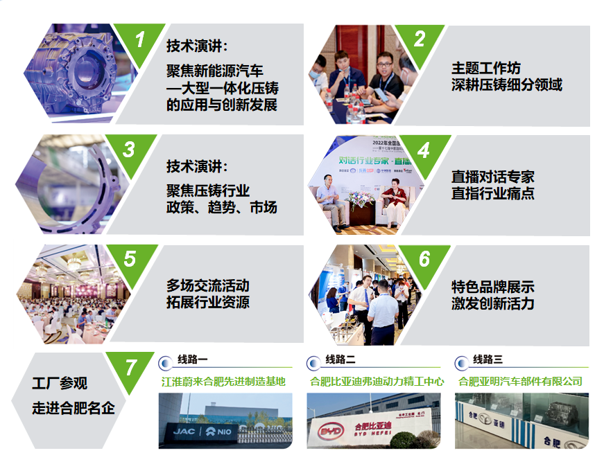 ![]() 2023全國壓鑄年會將于“3月22—24日”在合肥香格里拉大酒店舉辦,會議以“新能源汽車制造領航大壓鑄時代”為主題,聚焦行業熱點話題:涉及新材料研發、汽車主機廠產品及工藝設計、壓鑄上市公司技術及管理經驗分享等;內容覆蓋壓鑄全產業鏈:囊括設計、材料、模具、裝備、生產及用戶端等;800+參會代表:集結整車廠、壓鑄廠、高校及科研機構以及知名配套商等。參觀比亞迪、亞明、云海金屬。誠邀各位壓鑄同仁蒞臨! 主題工作坊 汽車鑄造俱樂部系列活動(合肥站) 時間:3月23日17:00—18:20 地點:合肥香格里拉大酒店2樓瀘沽廳 為進一步打通整車廠、壓鑄廠、裝備企業、周邊配套企業等全產業鏈溝通橋梁,促進行業協同發展,中國機械工程學會鑄造分會集各方資源打造全新汽車鑄造領域菁英圈層及學習型組織—“汽車鑄造俱樂部”,并定期舉辦系列沙龍,邀請來自有色鑄造領域及其他跨行業專家分享前沿技術和見解。 汽車鑄造俱樂部匯聚了來自于特斯拉、沃爾沃、蔚來、理想、小鵬、長安、寶馬、大眾、通用、愛馳、奇瑞、華人運通、極氪、舍弗勒、麥格納、諾瑪科、美諾等知名整車廠及零部件企業的技術、研發、采購等崗位,他們憑借著對行業發展的高度敏感及在專業領域的深耕,圍繞新形勢下整車廠的需求、供應鏈協同研發、共同提升材料、技術、工藝等方面話題展開深度的交流與討論。 2023全國壓鑄年會,主辦方將通過圓桌論壇的形式,搭建與知名車企及解決方案提供商直接對話的平臺,共同探討當下行業熱點話題:如汽車輕量化、新能源汽車、大型一體化壓鑄等。 贊助單位