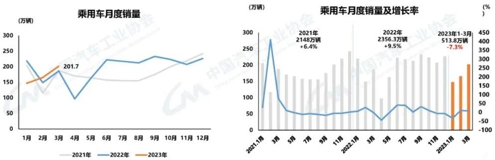 乘用車產銷較快增長 3月,乘用車產銷分別完成214.9萬輛和201.7萬輛,環(huán)比分別增長25.3%和22%,同比分別增長14.3%和8.2%。1-3月,乘用車產銷分別完成526.2萬輛和513.8萬輛,同比分別下降4.3%和7.3%。