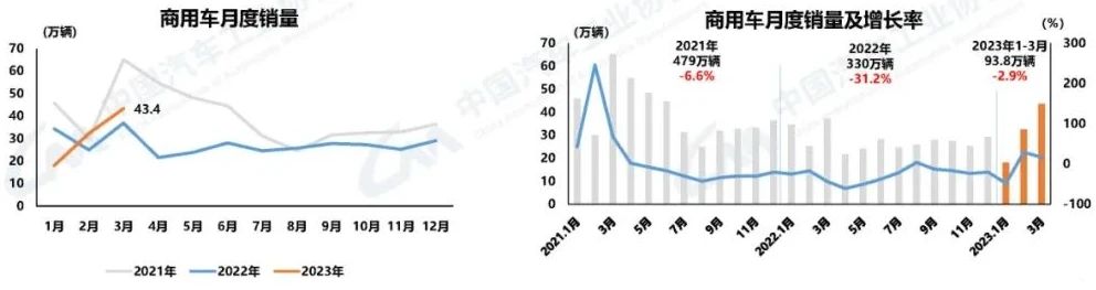 商用車產銷同比環(huán)比雙增長 3月,商用車產銷均完成43.4萬輛,環(huán)比分別增長37.1%和34.2%,同比分別增長20.4%和17.4%。商用車繼續(xù)延續(xù)了2月的產銷同比、環(huán)比雙增長的態(tài)勢。1-3月,商用車產銷分別完成94.8萬輛和93.8萬輛,同比分別下降3.9%和2.9%。