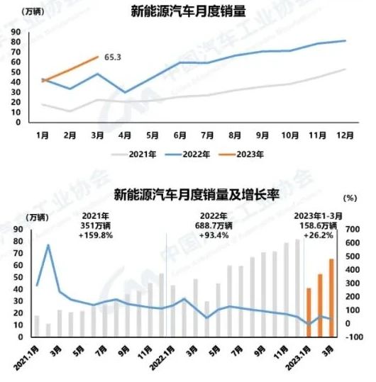 新能源汽車產銷同比持續(xù)增長 3月,新能源汽車產銷分別完成67.4萬輛和65.3萬輛,同比分別增長44.8%和34.8%,市場占有率達到26.6%。1-3月,新能源汽車產銷分別完成165萬輛和158.6萬輛,同比分別增長27.7%和26.2%,市場占有率達到26.1%。