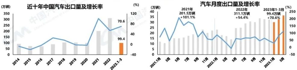 汽車出口持續(xù)迅猛增長 3月,汽車企業(yè)出口36.4萬輛,環(huán)比增長10.6%,同比增長1.1倍。汽車出口延續(xù)了去年強勢出口的態(tài)勢,今年以來增速不斷攀升。1-3月,汽車企業(yè)出口99.4萬輛,同比增長70.6%。