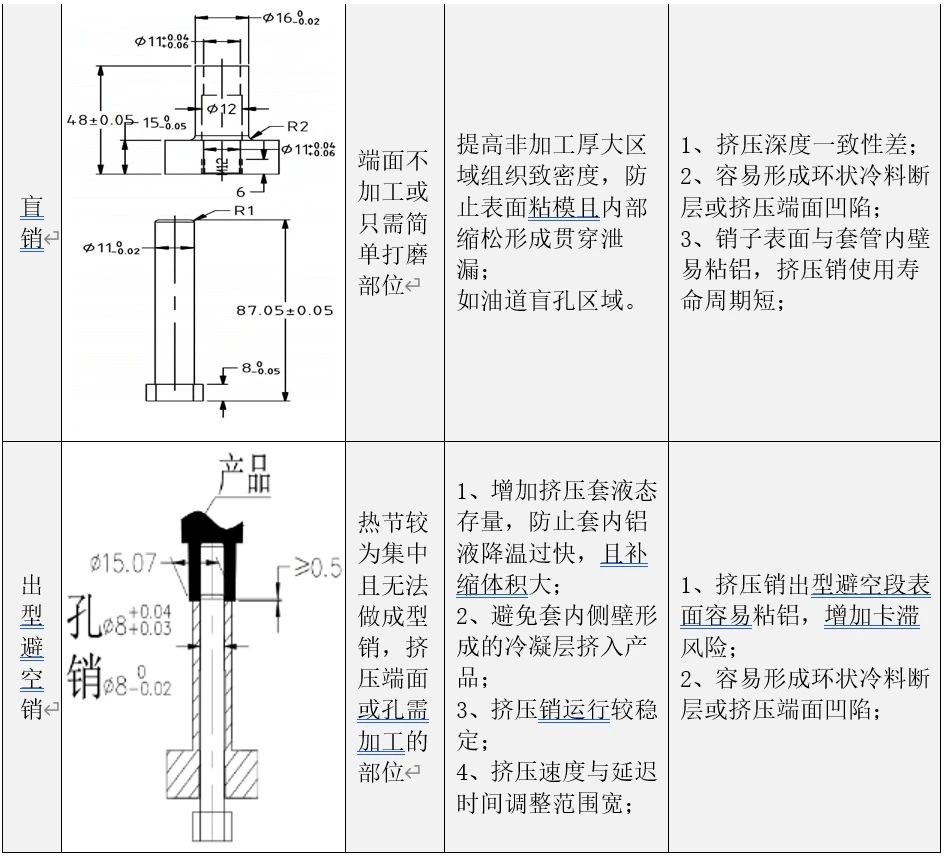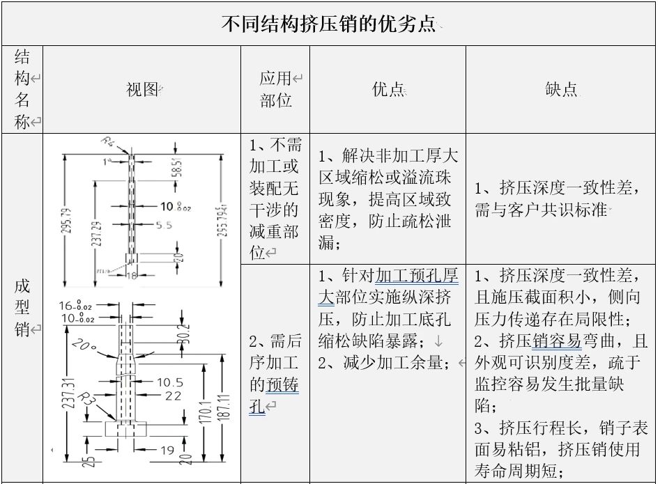 ![]() 原標(biāo)題:擠壓銷設(shè)計與應(yīng)用 摘要:基于擠壓銷在使用過程中受結(jié)構(gòu)設(shè)計,配合精度以及應(yīng)用部位溫度變化影響,導(dǎo)致故障率高,使用壽命短,以此增加壓鑄件生產(chǎn)過程問題的處理與管控難度;文章就如何正確選擇合適的擠壓銷,匹配合理參數(shù),控制“溫度場”,從而提高擠壓銷運(yùn)行的穩(wěn)定性,使產(chǎn)品被擠壓部位質(zhì)量缺陷得以解決。 前言:縮孔是鋁合金壓鑄件的致命質(zhì)量缺陷及報廢原因之一,其形成的機(jī)理是合金液凝固時的收縮特性所致。產(chǎn)品壁厚不均,薄壁處優(yōu)先凝固,阻礙合金液流動和壓力傳遞,局部厚大熱節(jié)部位無法補(bǔ)縮而形成縮孔。而局部加壓補(bǔ)縮(以下簡稱:擠壓銷)是有效解決縮孔缺陷的主要工藝措施。 由于被擠壓區(qū)域鋁液和模具溫度變化,擠壓銷結(jié)構(gòu)設(shè)計與裝配尺寸的影響,使其在實(shí)際應(yīng)用中壽命短,易卡滯或卡死,擠壓效果不佳,被擠壓區(qū)域存在分層現(xiàn)象,且工藝量化固化困難,導(dǎo)致生產(chǎn)連續(xù)性差,產(chǎn)品質(zhì)量不穩(wěn)定。本文就如何用好擠壓工藝,在擠壓銷的結(jié)構(gòu)設(shè)計和應(yīng)用上作簡要解析。 01擠壓銷結(jié)構(gòu)分類與優(yōu)劣點(diǎn)概述 擠壓結(jié)構(gòu):擠壓銷常用結(jié)構(gòu)可分為“成型銷,盲銷,出型避空銷”。通常基于產(chǎn)品缺陷部位形狀,所處位置與后工序處理要求而選擇不同結(jié)構(gòu)的擠壓銷,在“表1”列表中針對三種不同形態(tài)的擠壓銷的優(yōu)、劣點(diǎn)作了橫向比較。