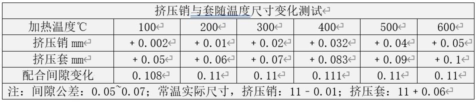 表2 擠壓銷與套隨溫度尺寸變化測試