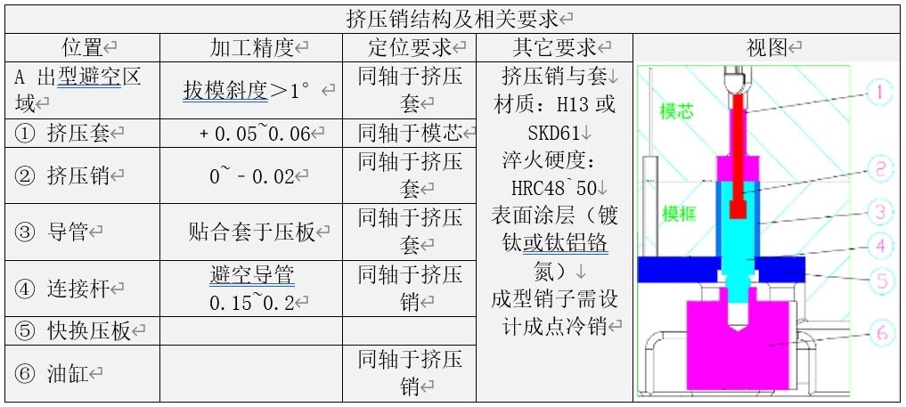 表3 擠壓銷結(jié)構(gòu)及相關(guān)要求 03擠壓銷的幾個關(guān)鍵參數(shù) 1)擠壓延時:擠壓延時通常指型腔充填完成或者增壓啟動開始,至擠壓銷啟動這段時間。延時過短,整個型腔金屬處于全液態(tài)狀態(tài),金屬液尚未達(dá)到固-液相轉(zhuǎn)變溫度,在此階段型腔內(nèi)金屬液流動性好,可通過澆道在鑄造壓力作用下得到整體補(bǔ)縮,但不能達(dá)到厚大區(qū)域局部補(bǔ)縮的目的;延時過長,用于擠壓補(bǔ)縮的金屬液或需補(bǔ)縮部位的液體已凝固,喪失流動性,從而失去補(bǔ)縮的功能;正確的延時是需補(bǔ)縮的區(qū)域已成為孤立的固-液相區(qū),其周邊通道已經(jīng)固化,擠壓補(bǔ)縮于厚大部位的最后凝固區(qū)。 2)持壓時間:是指擠壓銷開始施壓到施壓結(jié)束這段時間。該段時間的長短以被擠壓區(qū)域金屬液固化,擠壓區(qū)域不產(chǎn)生溢流珠為最短合適的時間,多則無益。該時間段的長短受被擠壓熱節(jié)區(qū)域體積大小,模具溫度,鋁液溫度變化影響。