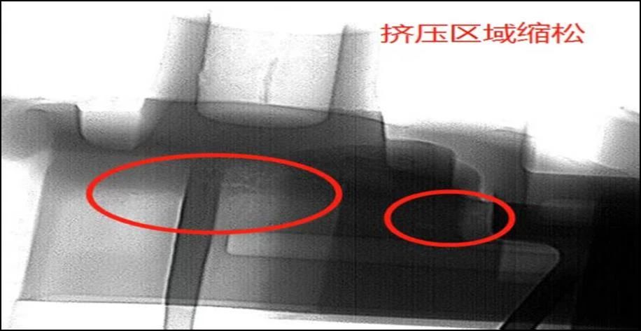 V1=S1×T×A 4)擠壓區(qū)域溫度:該溫度是指由熱節(jié)區(qū)域合金液溫度,模具溫度,擠壓銷溫度所共同構(gòu)成的“溫度場”,該“溫度場”的穩(wěn)定與否直接關(guān)系到擠壓的效果。 綜合所述,擠壓銷的擠壓效果如何,一方面取決于上述參數(shù)設(shè)置是否合理。另一方面取決于各參數(shù)是否穩(wěn)定,特別是“溫度場”的相關(guān)參數(shù)。在實(shí)際生產(chǎn)過程中,需多次驗證,通過產(chǎn)品外觀,擠壓深度,X射線探傷等判定是否達(dá)到擠壓效果,從而固化并穩(wěn)定相關(guān)參數(shù)。 04案例分享
