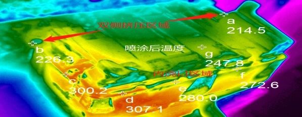 圖2 高壓油道擠壓區(qū)域缺陷 通過模具溫度測量,發(fā)現(xiàn)右側(cè)高壓油道擠壓區(qū)域噴涂后溫度偏高,“溫度場”發(fā)生變化,液態(tài)量因此增多,影響擠壓銷施壓效果。“圖3”中,右側(cè)溫度為214.5℃。