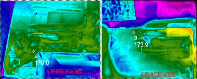 圖3 高壓油道擠壓區(qū)域溫度 經(jīng)排查發(fā)現(xiàn),下滑塊循環(huán)冷卻水處于關(guān)閉狀態(tài),導(dǎo)致右側(cè)擠壓區(qū)域質(zhì)量波動。“圖4”中測溫復(fù)查結(jié)果顯示,開啟冷卻水后,右側(cè)降溫至173.9℃,左側(cè)降溫至176.0℃;X射線探傷確認(rèn),右側(cè)高壓油道擠壓區(qū)域無縮松。注:調(diào)整期間需測量擠壓深度變化,并以X射線探傷確認(rèn)質(zhì)量。