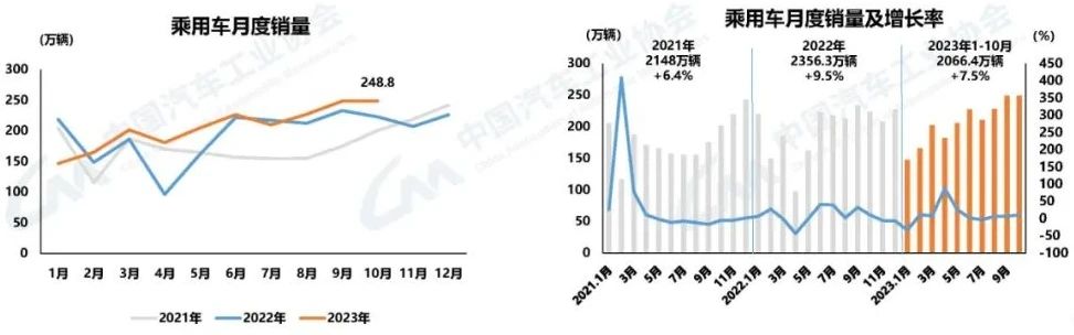 1-10月,我國汽車產銷分別完成2401.6萬輛和2396.7萬輛,同比分別增長8%和9.1%。其中,乘用車產銷分別完成2073.1萬輛和2066.4萬輛,同比分別增長6%和7.5%;商用車產銷分別完成328.6萬輛和330.3萬輛,同比分別增長22.1%和19.8%;新能源汽車產銷完成735.2萬輛和728萬輛,同比分別增長33.9%和37.8%,市場占有率達到30.4%。
