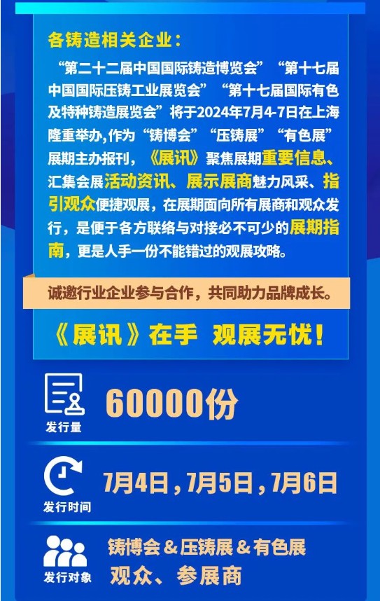 ![]() 各鑄造相關企業: “第二十二屆中國國際鑄造博覽會”“第十七屆中國國際壓鑄工業展覽會”“第十七屆國際有色及特種鑄造展覽會”將于2024年7月4-7日在國家會展中心(上海)舉辦。作為“鑄博會”展期主辦報刊,《展訊》聚焦展期重要信息、匯集會展活動資訊、展示展商魅力風采、指引觀眾便捷觀展,在展期面向所有展商和觀眾發行,是便于各方聯絡與對接必不可少的展期指南,更是人手一份不能錯過的觀展攻略。