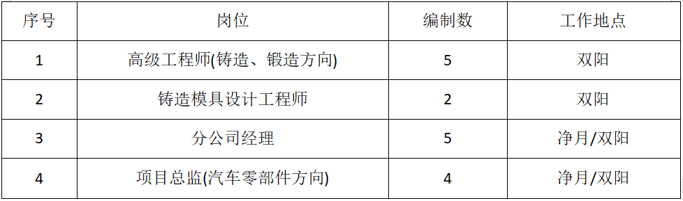二、崗位主要職責 1.高級工程師(鑄造、鍛造方向)崗位職責 (1)技術研發與工藝改進 負責鑄造、鍛造領域新技術、新工藝、新材料的研發與應用,提高生產效率和產品質量。對現有鑄造、鍛造工藝進行分析和評估,持續改進工藝參數,解決生產中的質量問題和技術難題。 參與制定和修訂鑄造、鍛造工藝標準和操作規范,確保工藝的穩定性和可靠性。 (2)產品設計與開發 與產品設計團隊緊密合作,參與新產品的鑄造、鍛造工藝設計,提供專業的技術支持和建議。 對產品的鑄造、鍛造工藝性進行審查,優化產品結構,降低生產成本,提高產品的可制造性。 負責新產品的鑄造、鍛造樣件制作和工藝驗證,跟蹤產品的試生產和量產過程,及時解決出現的問題。 (3)生產技術指導與管理 指導和培訓鑄造、鍛造車間的技術人員和操作人員,提高他們的技術水平和操作技能。制定生產計劃和工藝流程,合理安排生產資源,確保生產任務按時完成。監控生產過程,及時處理生產中的技術問題和質量事故,保證生產的順利進行。 (4)質量控制與檢測 建立和完善鑄造、鍛造產品的質量控制體系,制定質量檢驗標準和流程。對原材料、半成品和成品進行質量檢驗和檢測,確保產品質量符合標準和客戶要求。分析質量數據,找出質量問題的根源,采取有效的糾正措施和預防措施,提高產品質量的穩定性。 (5)項目管理與團隊協作 負責鑄造、鍛造相關項目的策劃、組織和實施,確保項目按時、按質、按量完成。 協調與其他部門之間的工作關系,如采購、質量、銷售等,確保整個生產過程的順利進行。 帶領技術團隊開展技術攻關和創新工作,培養和提升團隊的技術能力和創新能力。 技術交流與市場調研 關注國內外鑄造、鍛造行業的技術發展動態和市場趨勢,參加行業會議和技術交流活動,了解最新的技術成果和應用案例。 收集和分析市場信息,為公司的產品研發和市場拓展提供技術支持和決策依據 2.鑄造模具設計工程師崗位職責 (1)負責鋁合金 CPC 模具、傾轉重力模具的設計、制造和調試工作。 (2)能熟練運用設計軟件進行三維和二維圖形設計。 (3)與鑄造現場工程師緊密合作,了解生產工藝,并根據工藝要求進行模具設計。 (4)按照設計要求,選定合適的模具材料; 對設計結果進行驗證,確保模具能夠滿足生產要求,并保證產品質量, (5)參與項目討論和評審,對設計方案提出改進意見和建議。 (6)參與模具的報價: 3.分公司經理崗位職責 (1)戰略規劃與決策 依據集團公司戰略,結合市場狀況,制定分公司短、中、長期發展規劃,明確業務方向與目標,為分公司運營提供指引;針對分公司運營中的重大事項,如投資、業務拓展合作等,進行科學分析與決策,確保決策符合公司利益與發展戰略。 (2)業務運營管理 負責分公司日常運營,把控生產、銷售、研發、采購等環節,保障各部門高效協同;定期分析運營數據,監控運營指標,及時發現并解決問題,持續優化運營流程,提升運營效率與效益。 (3)團隊管理與建設 組建并管理分公司團隊,明確各部門職責與分工,合理分配工作任務;制定團隊培訓與發展計劃,提升員工專業技能與綜合素質,營造積極向上的團隊文化,增強團隊凝聚力與執行力。 (4)市場開拓與客戶維護 分析市場動態與競爭對手情況,制定市場開拓策略,拓展客戶資源,提升分公司市場份額;維護與重要客戶的合作關系,深入了解客戶需求,提供優質產品與服務,提高客戶滿意度與忠誠度。 (5)財務管理 制定并執行分公司財務預算,合理控制成本與費用,確保財務目標達成;負責財務風險管理,防范財務風險,保障分公司財務穩健。4.項目總監(汽車零部件方向)崗位職責 (1)主導汽車零部件項目的全流程管理,從前期規劃到最終交付,確保項目順利推進。 (2)制定項目戰略,分析市場需求與技術趨勢,推動項目創新與技術升級。 (3)組建并管理跨部門項目團隊,協調研發、生產、質量等多部門工作,激發團隊潛能。 (4)把控項目質量與成本,建立嚴格的質量管控體系,優化資源配置,降低成本。 (5)與客戶、供應商保持緊密溝通,維護良好合作關系,拓展業務渠道。 三、任職條件 (一)任職要求 1.高級工程師(鑄造、鍛造方向)任職要求 (1)材料成型及控制工程、鑄造工程、鍛造工藝等相關專業本科及以上學歷。 (2)有5年以上鑄造或鍛造領域相關工作經驗,熟悉鑄造或鍛造的工藝流程、設備操作和質量控制等環節。有大型項目經驗或解決復雜技術問題經歷者優先。 (3)精通鑄造或鍛造工藝設計,能熟練運用相關軟件進行工藝模擬和優化,如ProCAST、DEFORM 等。 (4)掌握材料學知識,熟悉各類鑄造、鍛造材料的性能和應用,能根據產品需求合理選材。 (5)具備優秀的團隊管理與溝通協調能力,能有效解決復雜問題。 (6)有較強的市場洞察力與風險預判能力,抗壓能力強。 (7)英語或德語可作為工作語言。 2.鑄造模具設計工程師任職要求 (1)模具設計、機械設計或相近專業,5年以上鋁合金重力,低壓或 CPC 模具設計工作經驗。 (2)熟練掌握 CAD/模流分析軟件。 (3)具備良好的溝通能力和團隊合作精神,能夠與相關部門和客戶進行有效的溝通。 (4)具備較強的責任心和工作計劃能力。 (5)年齡要求:45歲以下 3.分公司經理任職要求 (1)本科及以上學歷,工商管理、經濟管理等相關專業優先。 (2)擁有 8-10年以上豐富的工作經驗,其中至少3-5 年擔任中高層管理崗