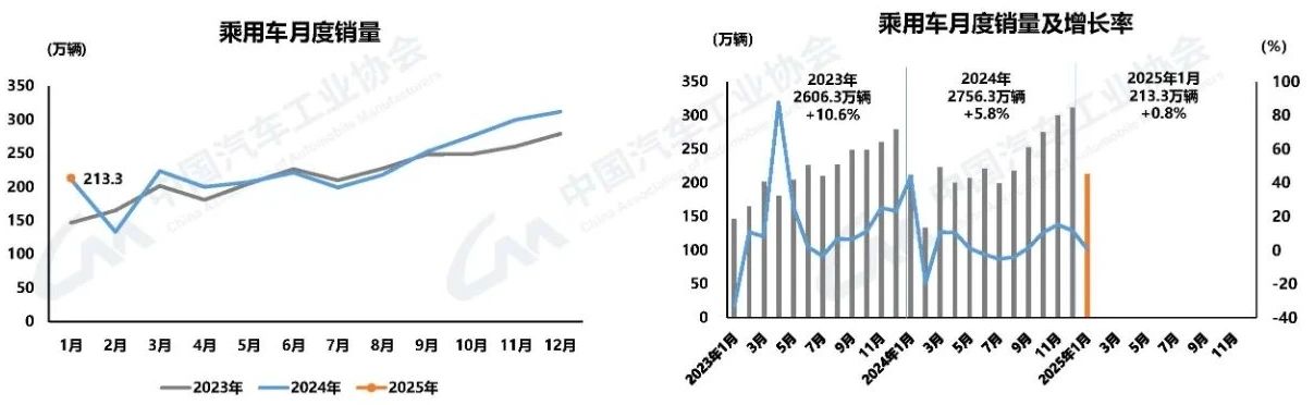 ![]() 2月17日,中國汽車工業(yè)協(xié)會發(fā)布了2025年1月汽車工業(yè)產銷情況。1月,汽車產銷分別完成245萬輛和242.3萬輛,環(huán)比分別下降27.2%和30.5%,產量同比增長1.7%,銷量同比下降0.6%。 中國汽車工業(yè)協(xié)會表示,今年1月我國汽車行業(yè)總體保持穩(wěn)定運行。其中,乘用車延續(xù)良好表現(xiàn),產銷量同比雙增;新能源汽車產銷和汽車出口也延續(xù)了良好態(tài)勢。 數據顯示,1月乘用車產銷分別完成215.1萬輛和213.3萬輛,同比分別增長3.3%和0.8%。