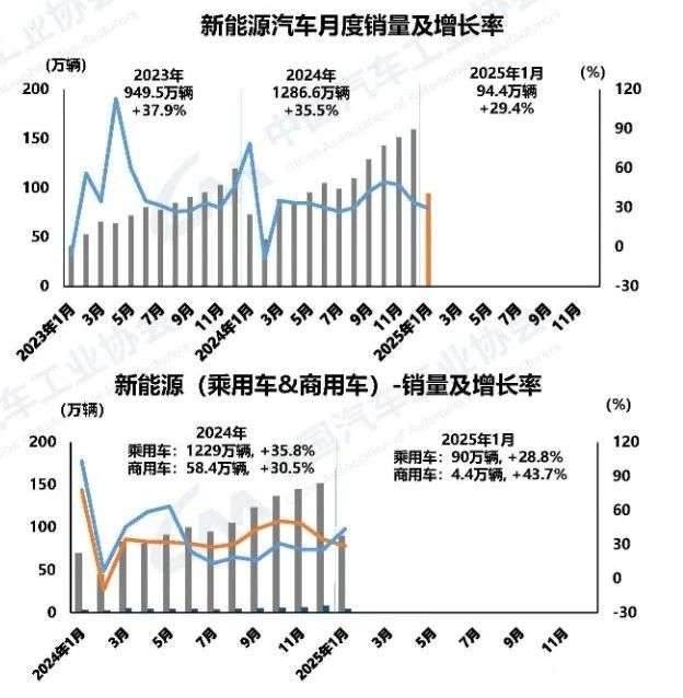 在新能源汽車方面,1月新能源汽車產銷分別完成101.5萬輛和94.4萬輛,同比繼續(xù)保持較快增長,分別增長29%和29.4%。新能源汽車新車銷量占汽車新車總銷量的38.9%。