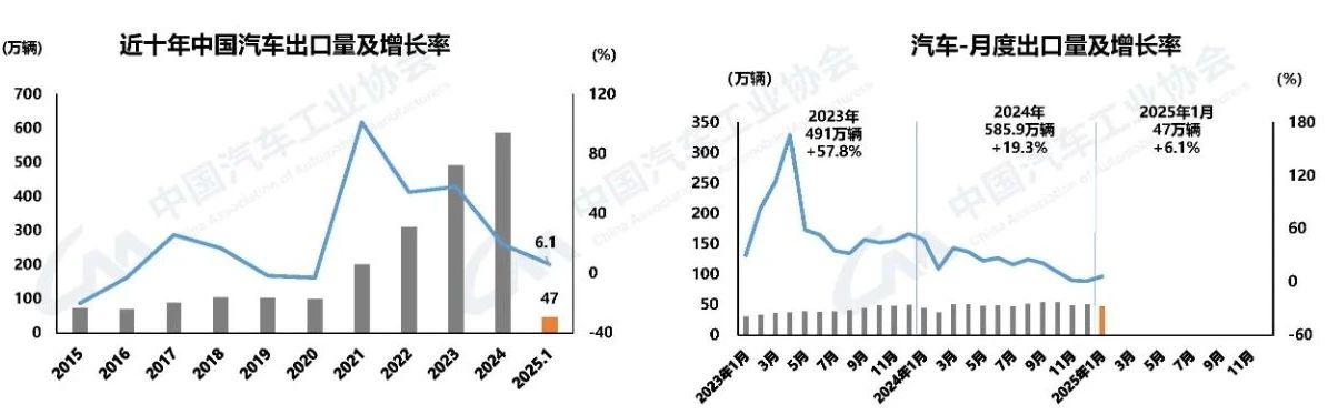 在出口方面,1月我國汽車出口總體達到47萬輛,同比增長6.1%。其中,新能源汽車出口15萬輛,同比增長49.6%。