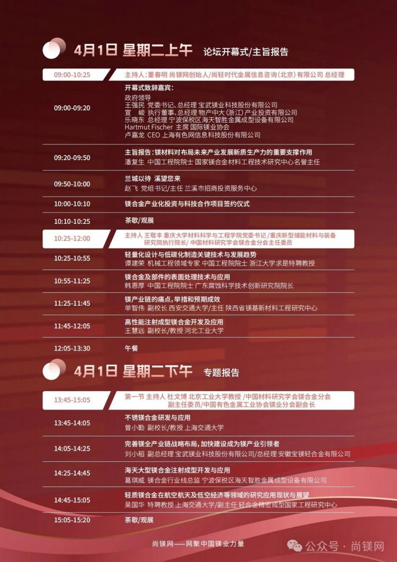 2025鎂產(chǎn)業(yè)鏈論壇三大亮點 2025鎂產(chǎn)業(yè)鏈與鎂市場論壇將于3月31日-4月2日在浙江金華舉行。本次論壇的主題是“鎂-為中國制造減重,為低碳經(jīng)濟賦能”。鎂產(chǎn)業(yè)鏈人士將再度聚首山清水秀之鄉(xiāng),借此契機匯聚更多力量,看見更多精彩,展現(xiàn)更大格局,在關(guān)鍵時期、關(guān)鍵議題上一起為鎂材料發(fā)聲、為鎂產(chǎn)業(yè)助力,共商構(gòu)建鎂產(chǎn)業(yè)鏈生態(tài)圈大計,以市場機制和市場力量推動鎂產(chǎn)業(yè)鏈高質(zhì)量發(fā)展,推動鎂材料的規(guī)模化的應(yīng)用! 本次論壇由尚鎂網(wǎng)、上海有色網(wǎng)聯(lián)合主辦,國家鎂合金材料工程技術(shù)研究中心、中國材料研究學(xué)會鎂合金分會特別支持,重慶大學(xué)長三角(蘭溪)鎂材料研究中心、蘭溪市華創(chuàng)金屬材料研究院有限公司特別協(xié)辦,寶武鎂業(yè)、物產(chǎn)中大產(chǎn)投、物產(chǎn)中大柒鑫合金、海天智勝金屬成型設(shè)備協(xié)辦,并得到了國際鎂學(xué)會、國際鎂業(yè)協(xié)會及多家骨干企業(yè)的支持,聚力搭建鎂產(chǎn)業(yè)鏈交流平臺。 論壇的首要亮點是聚焦鎂產(chǎn)業(yè)熱點議題和前沿科技 論壇期間,將安排23篇專題報告。中國工程院院士、重慶市科協(xié)主席、國家鎂合金材料工程技術(shù)研究中心名譽主任潘復(fù)生將做主旨演講,他將圍繞“鎂材料對布局未來產(chǎn)業(yè)發(fā)展新質(zhì)生產(chǎn)力的重要支撐作用”做高端分享。中國工程院院士、浙江大學(xué)求是特聘教授譚建榮將做題為“輕量化設(shè)計與低碳化制造關(guān)鍵技術(shù)與發(fā)展趨勢”的專題演講;中國工程院院士、廣東腐蝕科學(xué)技術(shù)創(chuàng)新研究院院長韓恩厚將做題為“鎂合金及部件的表面處理技術(shù)與應(yīng)用”的專題演講。寶武鎂業(yè)科技股份有限公司黨委書記、總經(jīng)理王強民、物產(chǎn)中大(浙江)產(chǎn)業(yè)投資有限公司總經(jīng)理宣峻、海天智勝金屬成型設(shè)備有限公司總經(jīng)理樂曉東、上海有色網(wǎng)信息科技股份有限公司首席執(zhí)行官盧嘉龍將在開幕式上發(fā)表致辭,國際鎂業(yè)協(xié)會主席Hartmut Fischer先生也將發(fā)表視頻致辭。 演講嘉賓還有來自國內(nèi)一流鎂合金研發(fā)機構(gòu)和團隊的領(lǐng)軍科學(xué)家,包括重慶大學(xué)、上海交大、西安交大、河北工業(yè)大學(xué)、湖南大學(xué);有來自國內(nèi)外鎂及鎂合金產(chǎn)業(yè)鏈領(lǐng)軍企業(yè)寶武鎂業(yè)、塞力斯汽車、上汽集團、海天智勝金屬成型設(shè)備、雅迪科技集團、通用汽車、質(zhì)子汽車、科源冶金等;有來自鎂產(chǎn)業(yè)相關(guān)協(xié)會和機構(gòu)的負責人和專家,包括國際鎂協(xié)、青陽縣人民政府、尚鎂網(wǎng)、上海有色網(wǎng)等。專題演講內(nèi)容涉及鎂業(yè)市場與形勢分析、高效鎂冶煉加工技術(shù)、鎂合金開發(fā)與應(yīng)用案例分享、鎂合金材料進展、鎂業(yè)可持續(xù)發(fā)展、鎂業(yè)公司戰(zhàn)略等。演講人均為行業(yè)知名專家和領(lǐng)軍企業(yè)高管,分享的都是鎂及鎂合金前沿科技和最佳產(chǎn)業(yè)實踐,契合當前產(chǎn)業(yè)化實際和行業(yè)熱點、焦點議題。 論壇的第二大亮點是設(shè)立展示交流區(qū),集中展示鎂產(chǎn)業(yè)鏈創(chuàng)新成果 論壇期間還將開設(shè)展示區(qū),目前全部展位已經(jīng)訂完。將有40家鎂產(chǎn)業(yè)鏈企業(yè)現(xiàn)場展示其最新開發(fā)的鎂合金產(chǎn)品、先進加工技術(shù)和裝備、原輔材料及相關(guān)服務(wù)。據(jù)悉,這將是全球范圍內(nèi)最多企業(yè)參與的鎂產(chǎn)業(yè)集中商業(yè)展示活動,如您到場,可以一站式接觸到目前最新開發(fā)的鎂產(chǎn)品和相關(guān)技術(shù)供應(yīng)商。今年參展企業(yè)極具代表性,展示產(chǎn)品和服務(wù)涉及原鎂及鎂合金材料、鎂合金壓鑄件、半固態(tài)加工產(chǎn)品、型材及板材和鍛件等變形加工產(chǎn)品、鎂合金壓鑄和半固態(tài)加工設(shè)備、鎂合金表面處理產(chǎn)品和技術(shù)、鎂合金鈑金件和精密加工產(chǎn)品、鎂業(yè)環(huán)保裝備和技術(shù)、鎂粉和鎂粒子加工設(shè)備、鎂溶劑及輔助材料、鎂檢測裝備和服務(wù)等。 目前已經(jīng)確定參展的知名企業(yè)包括:寶武鎂業(yè)、鎂瑞丁輕量化技術(shù)公司、海天智勝金屬成型設(shè)備、鎂陽智能裝備、交叉離子新材料、上海紫燕合金、寧波鑫林模具、山東天鎂新材料、伯樂智能裝備、山西銀光華盛鎂業(yè)、路飛鎂業(yè)、華孚精密科技、浙江連連寶、八達鎂業(yè)、陜西輕特鎂科技、吉同鎂合金科技、北京勵德展覽有限公司、物產(chǎn)中大柒鑫合金材料、舜富精密科技、瑞格金屬新材料、富亨迪新材料、重慶大學(xué)長三角(蘭溪)鎂材料研究中心、馬德寶真空泵設(shè)備、山東保藍環(huán)保、萬邦勝輝新能源科技、Stolfig Group(駛多飛集團)、伊之密、神木利臻科技、山東奧瑯智能科技、徠孚科技、聞喜縣康泰金屬制品、太倉萬信達化工、河南明鎂鎂業(yè)、北京適創(chuàng)科技、濮陽市名利石化機械設(shè)備、寧波得鑫科技有限公司、上栗縣科源冶金材料、貝匯特機械制造科技、湖北鎂器時代新材料有限公司等。 值得關(guān