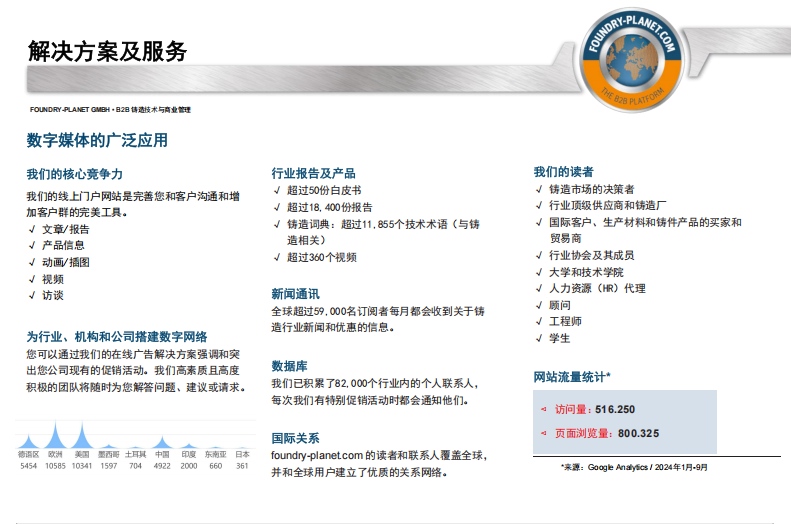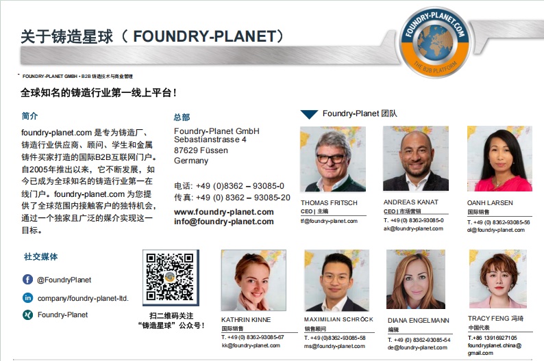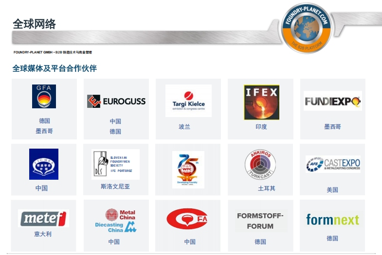 foundry-planet.com 是專為鑄造廠、鑄造行業(yè)供應商、顧問、學生和金屬鑄件買家打造的國際B2B互聯(lián)網(wǎng)門戶。自2005年推出以來,它不斷發(fā)展,如今已成為全球知名的鑄造行業(yè)第一在線門戶。foundry-planet.com 為您提供了全球范圍內(nèi)接觸客戶的獨特機會,通過一個獨家且廣泛的媒介實現(xiàn)這一目標。