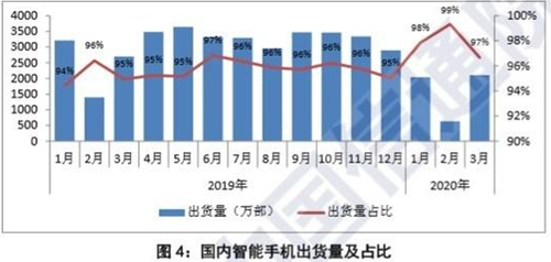 2020年1-3月,國內手機市場總體出貨量4895.3萬部,同比下降36.4%;其中2G手機108.6萬部、4G手機3380.7萬部,5G手機1406.0萬部。