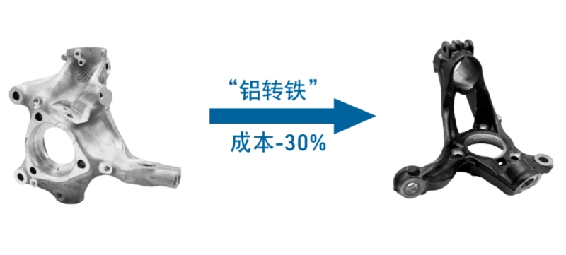 ![]() 近年來,新能源汽車市場迅速擴(kuò)張,輕量化成為提升車輛續(xù)航、性能等關(guān)鍵指標(biāo)的重要方向,主機(jī)廠對零部件輕量化需求愈發(fā)迫切。然而,輕量化材料及工藝往往伴隨著高成本,給主機(jī)廠帶來成本壓力,促使他們積極探尋可替代的解決方案。 在新能源汽車行業(yè)輕量化需求與成本壓力雙重博弈的當(dāng)下,GF成型方案推出的“鋁轉(zhuǎn)鐵”汽車轉(zhuǎn)向節(jié)(“鋁合金鑄造轉(zhuǎn)向節(jié)”轉(zhuǎn)換成“球墨鑄鐵轉(zhuǎn)向節(jié)”)創(chuàng)新解決方案脫穎而出。該方案憑借顯著的成本效益和卓越性能,成功獲得國際知名主機(jī)廠認(rèn)可,并用于其新能源車型的轉(zhuǎn)向節(jié)零件中,目前已進(jìn)入量產(chǎn)階段,為新能源汽車零部件發(fā)展提供了新思路。 GF“鋁轉(zhuǎn)鐵”方案:創(chuàng)新破局 GF成型方案敏銳捕捉行業(yè)痛點,創(chuàng)新性地提出“鋁轉(zhuǎn)鐵”方案。此方案在不改變零件性能的前提下,采用極具成本優(yōu)勢的球墨鑄鐵材料替代傳統(tǒng)鑄鋁材料,打造出兼具經(jīng)濟(jì)性與可靠性的“鋁轉(zhuǎn)鐵”轉(zhuǎn)向節(jié)產(chǎn)品。