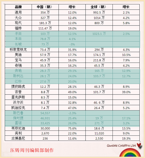 汽車制造業(yè)是壓鑄產(chǎn)業(yè)最大的用戶行業(yè),可以說中國壓鑄業(yè)十多年所取得的成就,汽車制造業(yè)的高速發(fā)展對壓鑄件巨大需求起到了至關(guān)重要的促進作用。因此關(guān)注汽車業(yè)發(fā)展是非常有必要的。2014年,中國汽車產(chǎn)銷量雙雙突破2300萬輛,連續(xù)六年蟬聯(lián)世界第一。以下為壓鑄周刊編輯整理有關(guān)2014年各大汽車廠商在中國和全球的整車銷量情況表。